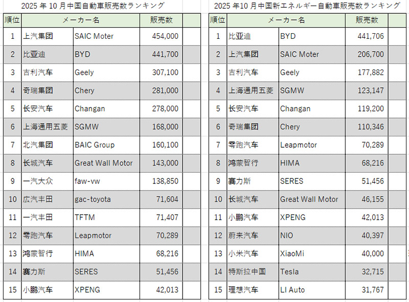 2025年10月最新中国自動車販売台数ランキングと、10月中国自動車販売の注目点をお伝えしました。